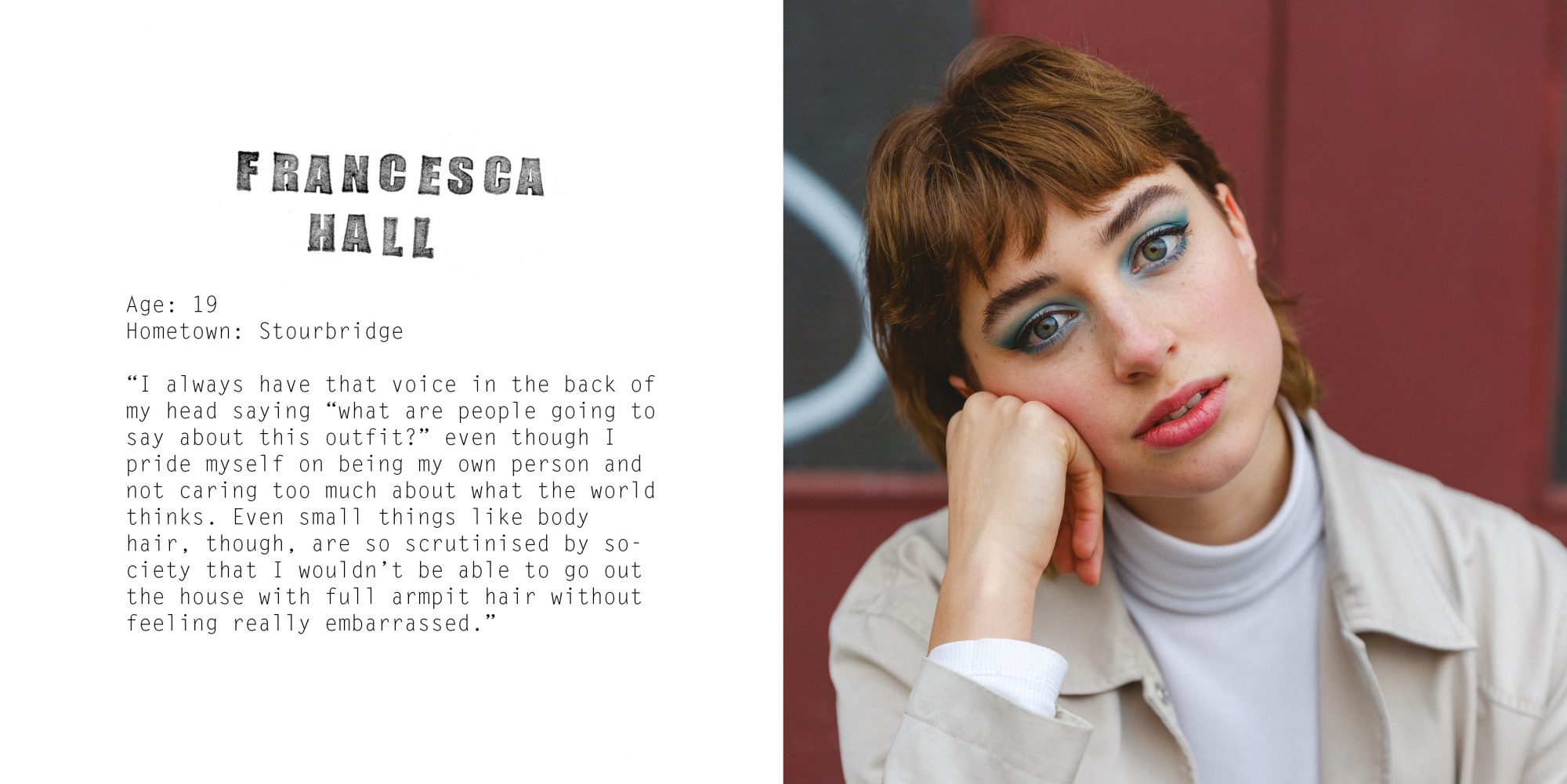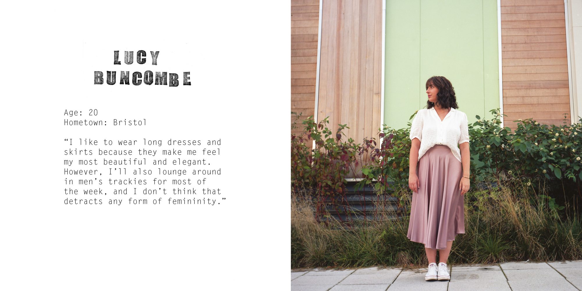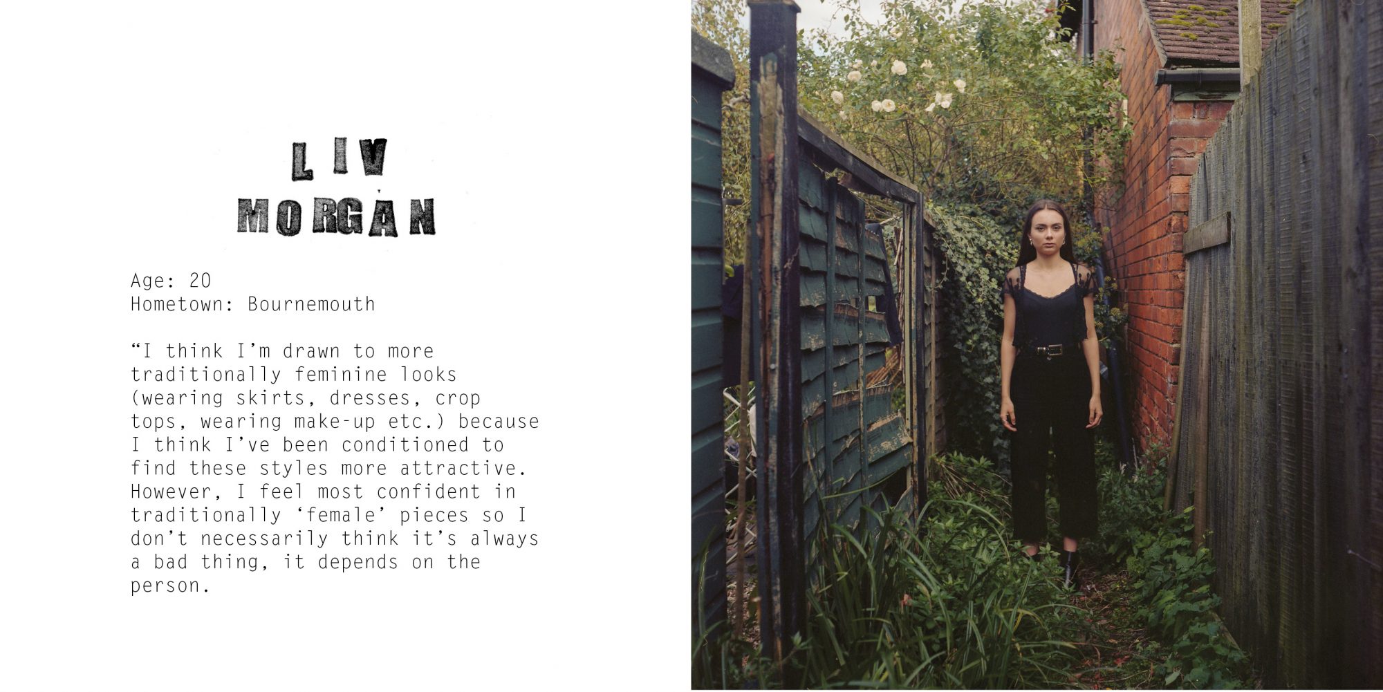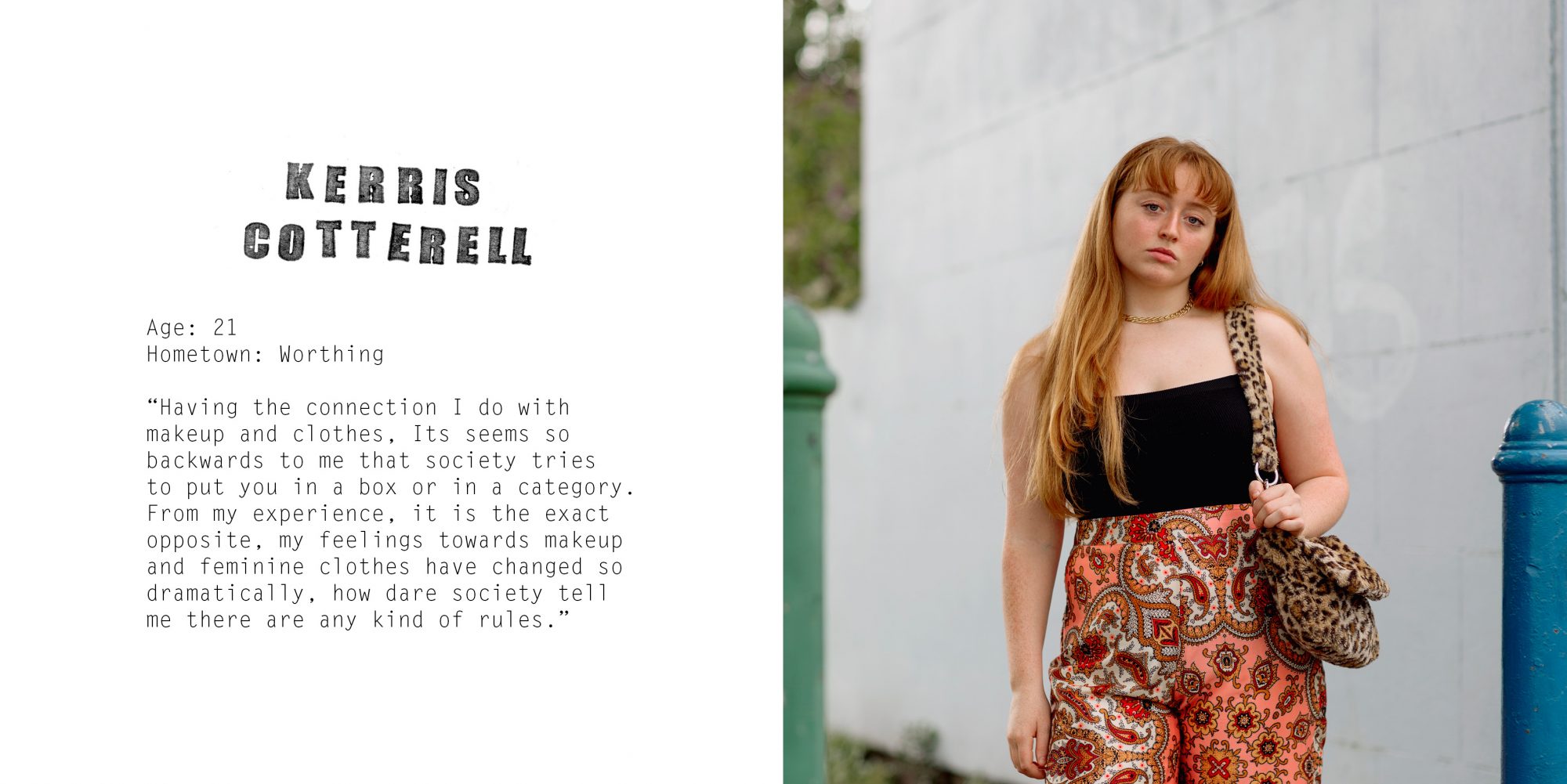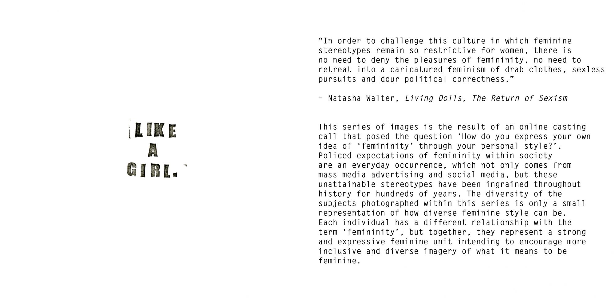Policed expectations of femininity within society are an everyday occurrence, which not only comes from mass media advertising and social media, but these unattainable stereotypes have been ingrained throughout history for hundreds of years. The diversity of the subjects photographed within this book is only a small representation of how diverse feminine style can be. Each individual has a different relationship with the term ‘femininity’, but together, they represent a strong and expressive feminine unit intending to encourage more inclusive and diverse imagery of what it means to be feminine.